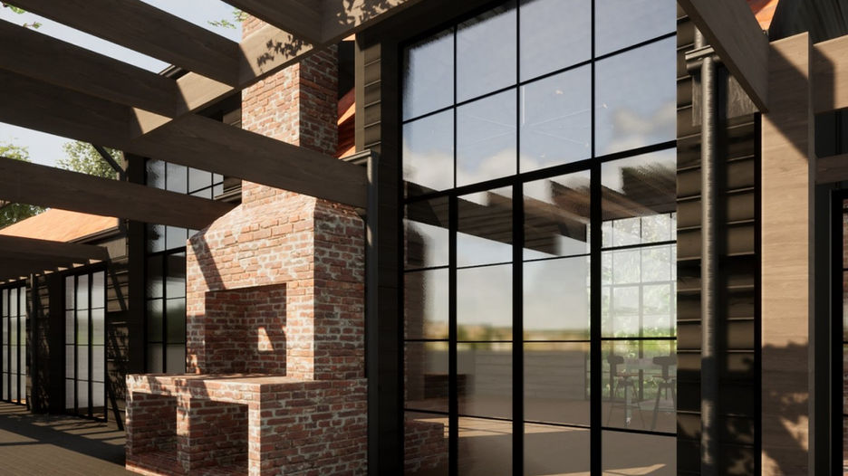 The robust, simple barn geometry is expressed through a palette of handmade terracotta roof tiles and blackened radial sawn weatherboards, grounding the building in its rural context while providing a warm, durable and timeless architectural presence.
