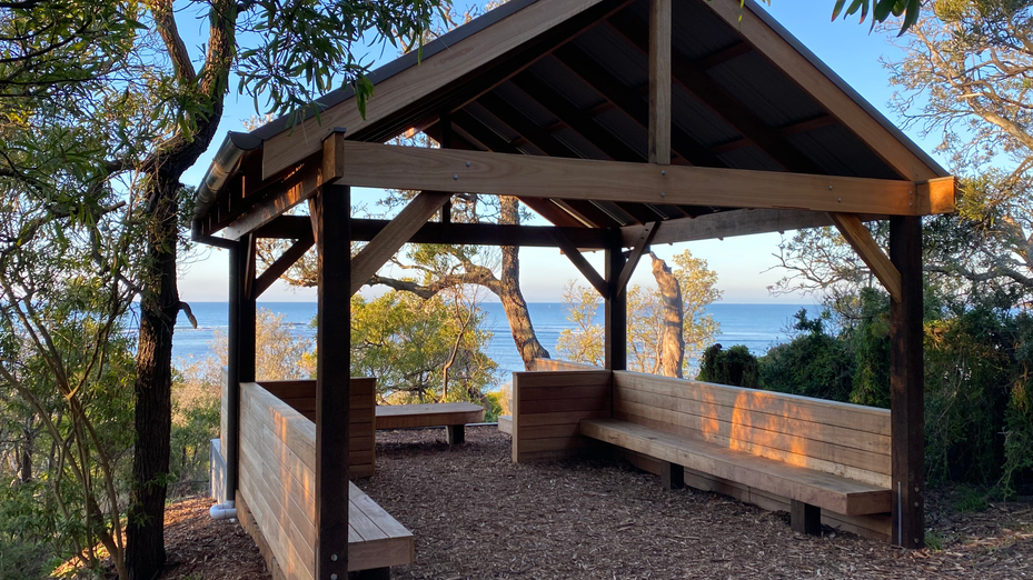 Each shelter has it's own purpose and identity; the largest, in the round, is a meeting place for large groups, such as scouts; it is s a place for story telling; performance; smoking ceremonies, cooking & eating together. The Point, as it has become known, is a lookout with multipurpose furniture that can give the local surfers the best vantage point to check out the nearby breaks or to engage in quiet reflection. All Australian hardwood construction should continue to provide shelter for many years to come in the harsh marine environment. Shelter 1, close to accessible amenities and provides a fully accessible seating area and BBQ.